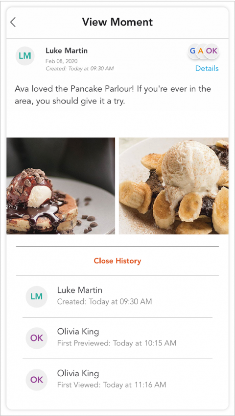 - First Viewed: This date/time signifies that your co-parent opened the Moment entry. By opening an entry, they can view its complete details including the location of the Moment, the complete history showing when the entry was created or edited, the complete note, and any attachments included with the entry.