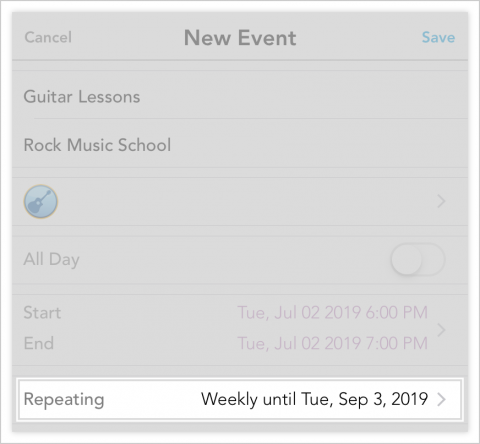 Note: You cannot edit the repeating pattern or duration settings for recurring events. If the repeating pattern or duration needs to be updated, delete all future instances of the event and recreate the entry.